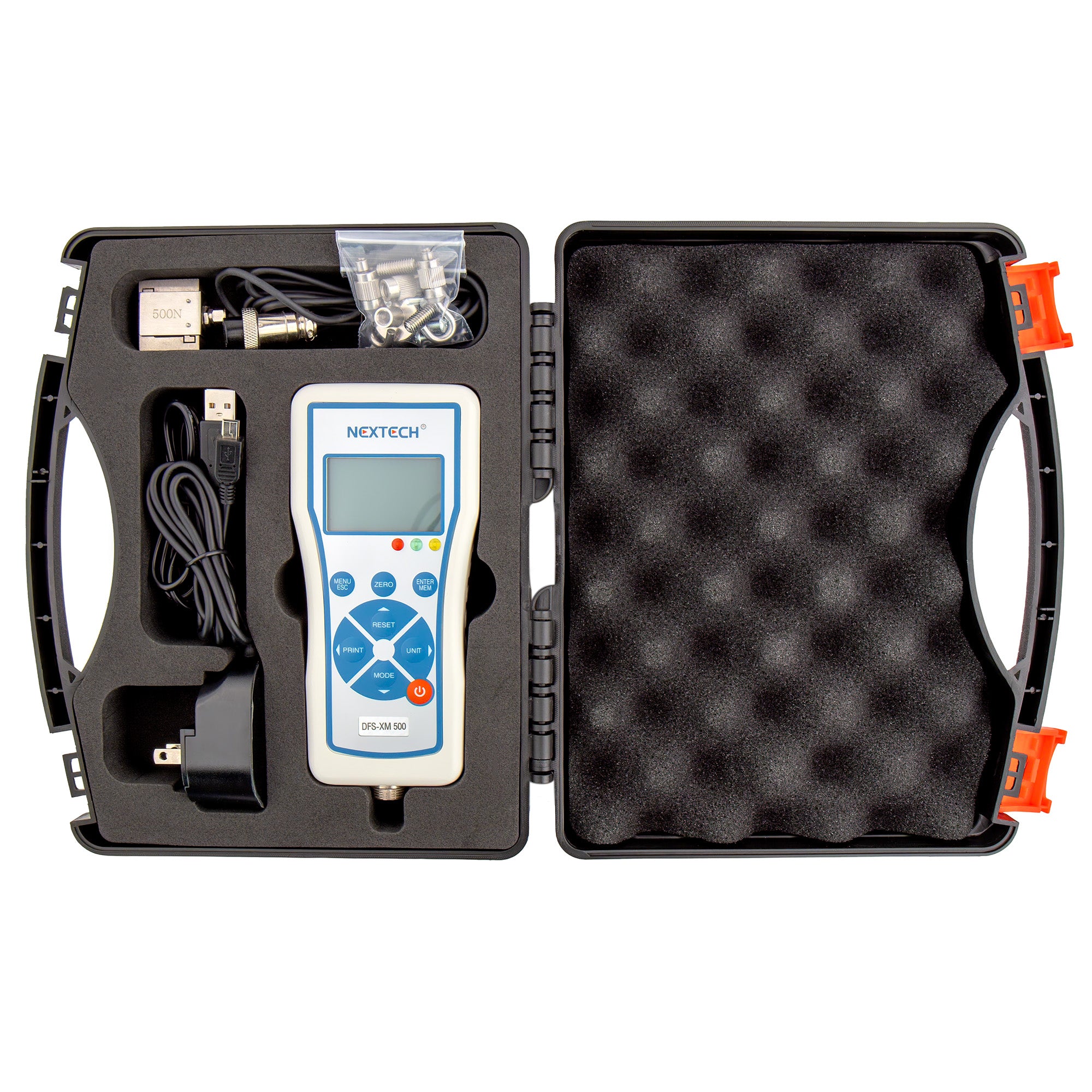 DFS-X-Series digital force gauges are cost-effective tension and compression testing tools. External transducers are perfect for applications where there is limited space for mounting to load and for remote viewing from the load. The metal housing with the large backlit graphics LCD allows for easy reading and fits well in your hand. The display can be inverted for a viewing that suits your testing position. Internal rechargeable NiMH Battery packs provide many hours of uninterrupted use.